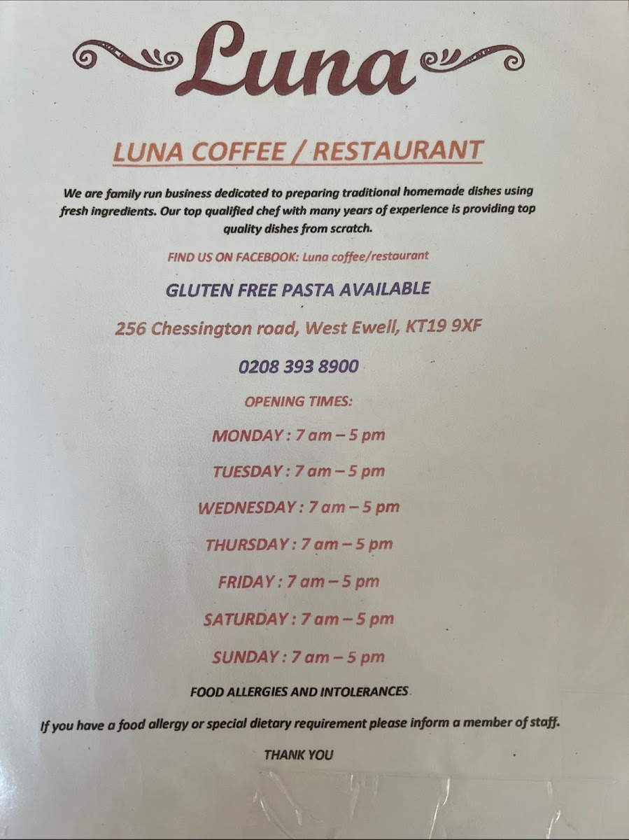 Tucked away in the heart of Ewell, Luna Coffee at 256A Chessington Rd, Ewell, Epsom KT19 9XF, United Kingdom, offers a cozy, welcoming space that goes far beyond your average café experience. I recently had the pleasure of visiting, and I must say, the Luna Coffee Menu is nothing short of delightful.